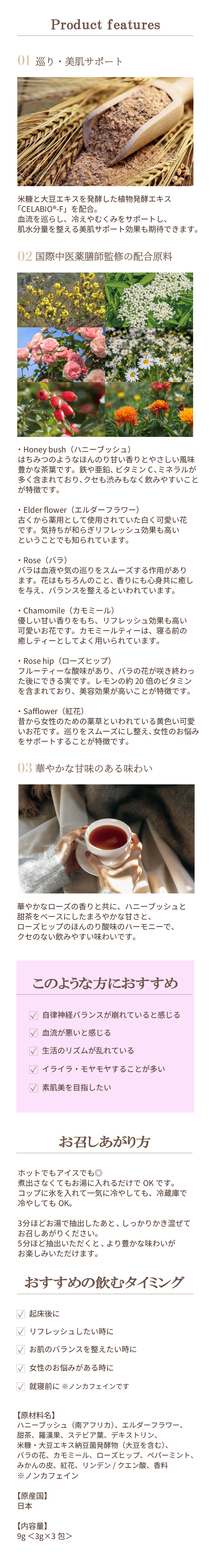 リラックスできる成分や巡りや美肌に良い成分など、女性に嬉しい成分をたっぷり配合!