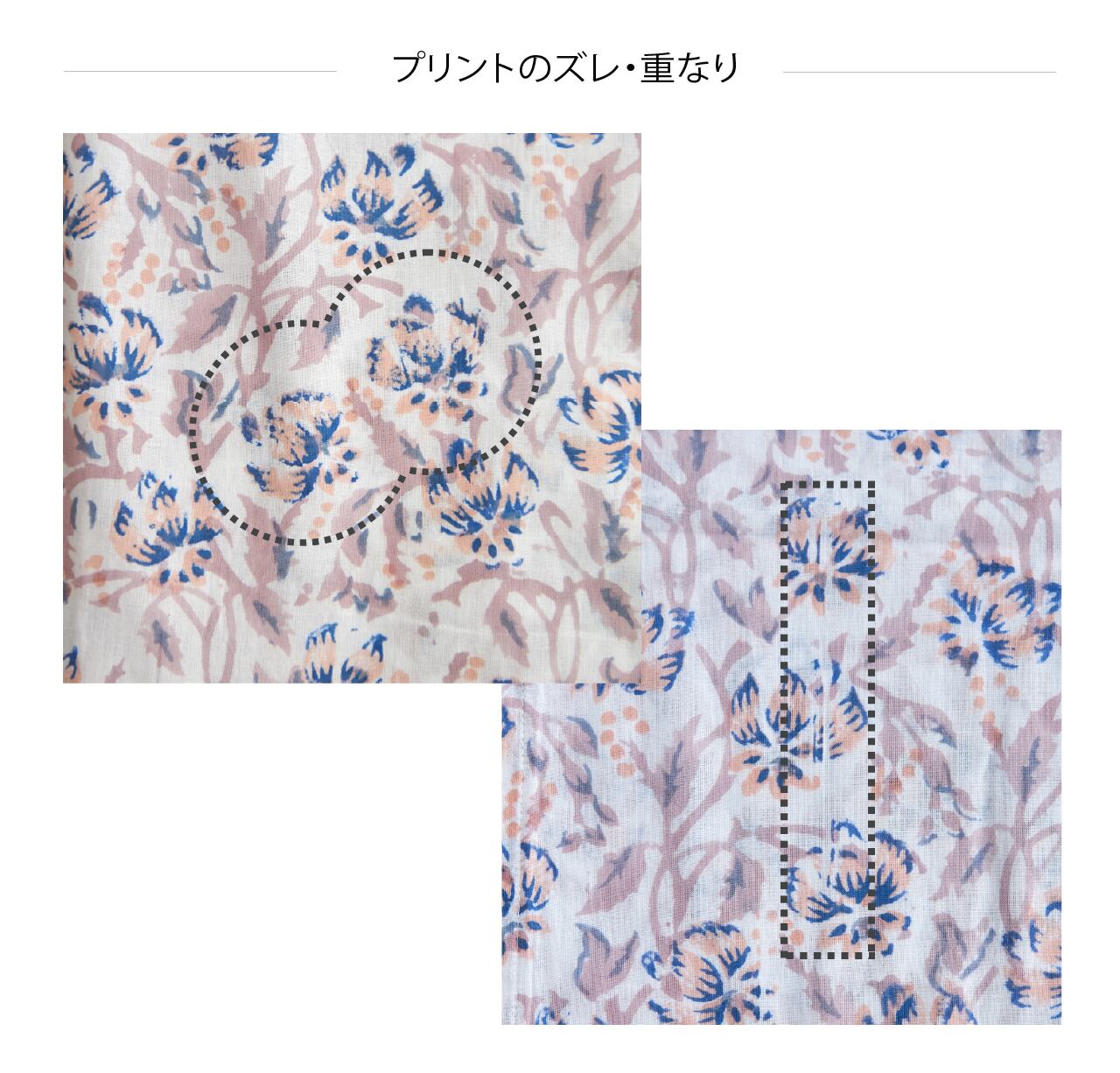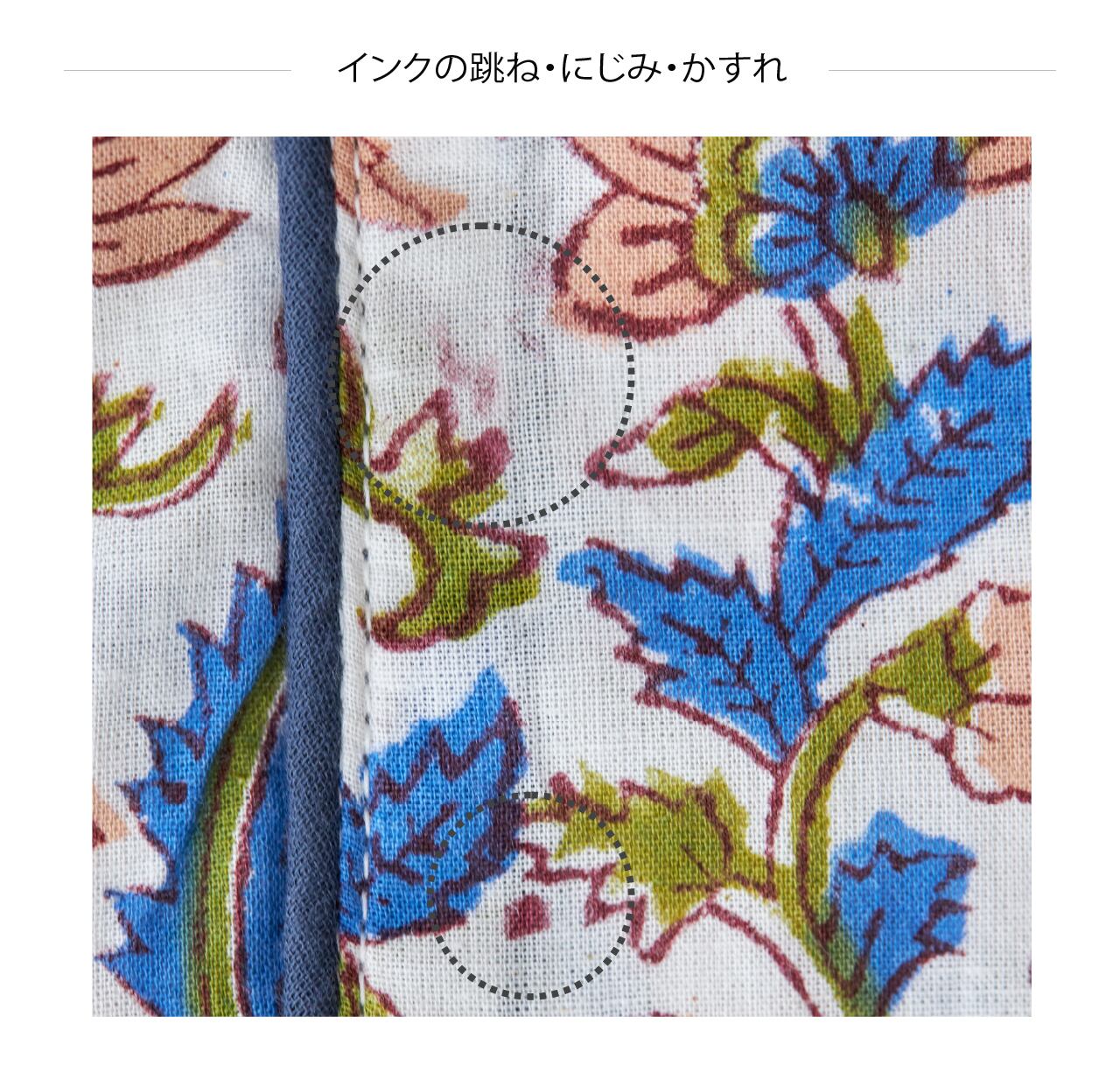 ・この製品はインド綿にハンドプリントをほどこしているため、生地に多少織りキズや汚れがあり、プリントの重なり・かすれ・ズレ・色むら、インクの跳ね等がございます。